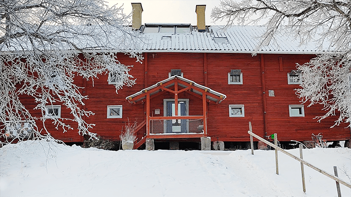 Utanför Ekobankens röda huvudkontor i vinterskrud